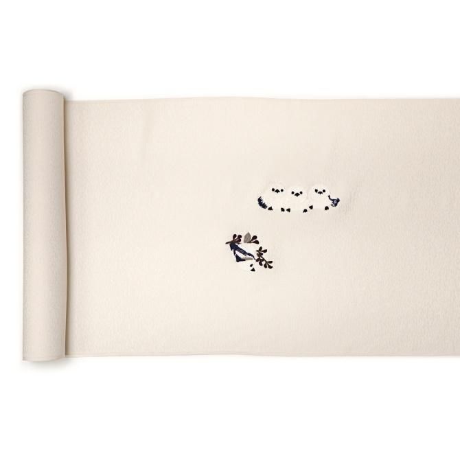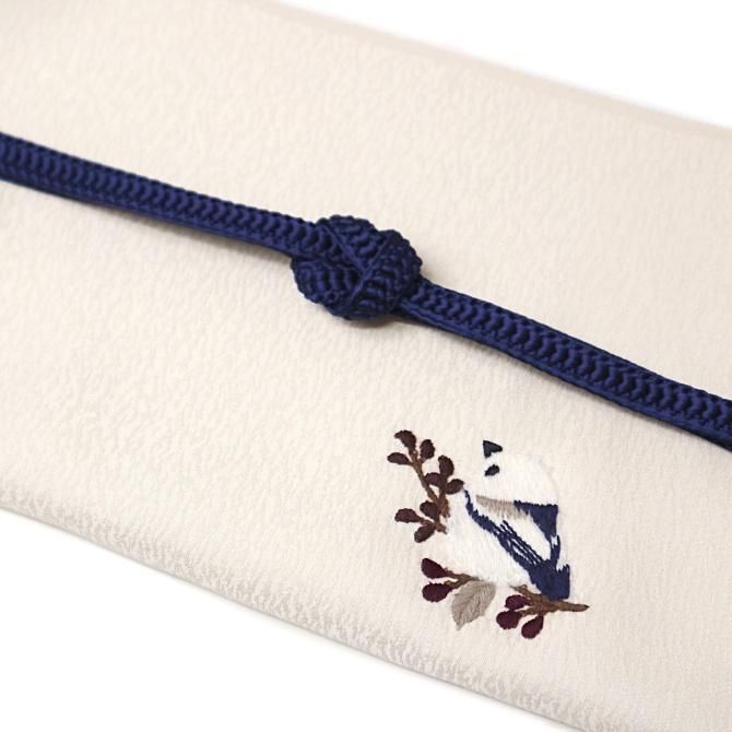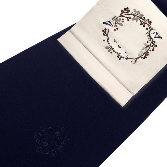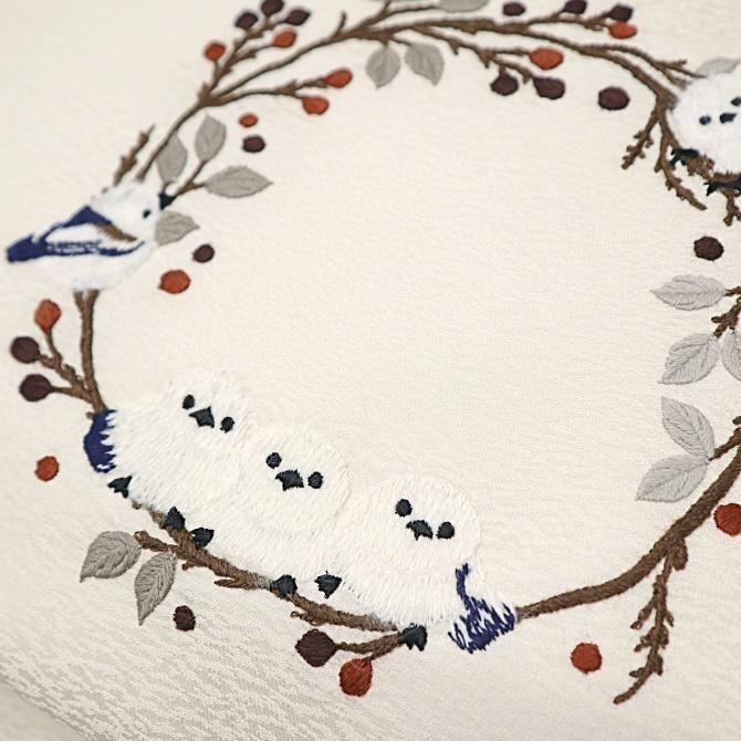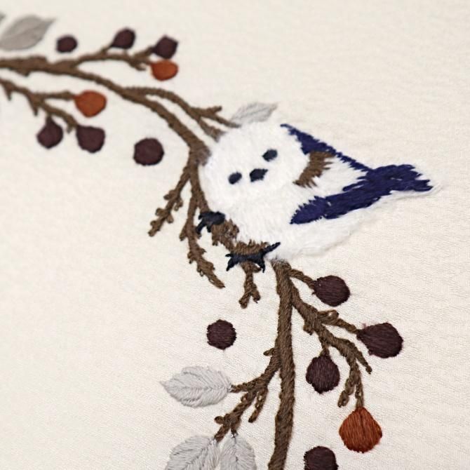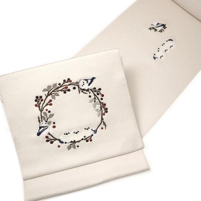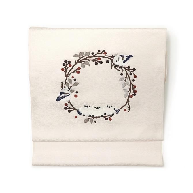 刺繍柄 九寸名古屋帯 「シマエナガ」 オフホワイト 枝 喰い鳥 止まり木 ふわふわ 鳥柄