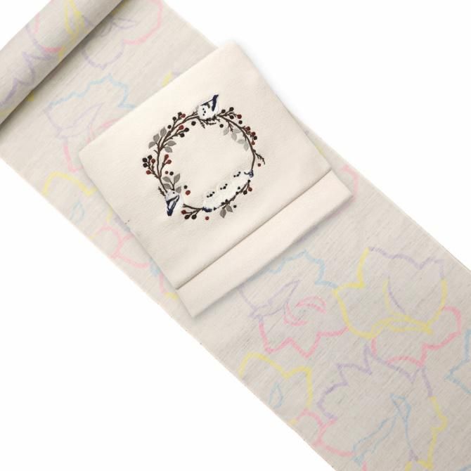 刺繍の立体感と刺繍糸の起毛が可愛らしい世界を創り出しているおしゃれ九寸帯。